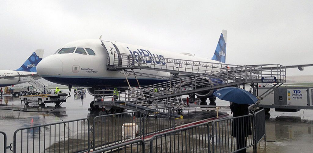 El avión, se disponía a viajar a Puerto Rico desde Nueva York, y mientras retrocedía, golpeó la cola de otro avión de la misma compañía que estaba estacionado y vacío en el aeropuerto internacional John F. Kennedy.